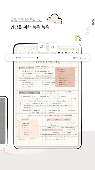 특히 PDF 주석 기능은 인상적입니다. 주요 부분을 형광펜으로 표시하거나 직선과 물결선을 그리며 메모를 더 정교하게 꾸밀 수 있습니다. 또한, 녹음 기능을 통해 회의나 강의를 실시간으로 기록하고, 나중에 메모와 함께 동기화된 녹음을 재생할 수 있습니다.