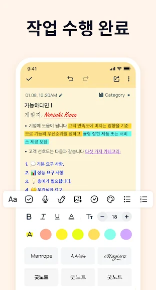 특히, 노트의 중요한 항목을 고정하거나 알림을 설정할 수 있어, 할 일을 놓치지 않고 체계적으로 관리할 수 있습니다. 또한, 색상과 배경을 자유롭게 선택해 노트를 개인화하고, 필요한 카테고리별로 정리할 수 있어 업무와 일상 모두에 활용하기 좋습니다.