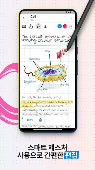 플렉슬만의 특별한 펜 제스처 UX는 두 번의 터치로 주석 추가, 스크랩 등을 손쉽게 할 수 있습니다. 확대해도 선명한 벡터 방식의 필기 엔진과 형광펜 기능은 깔끔한 필기 경험을 제공합니다.