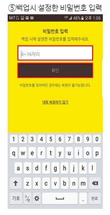 복원을 위해 백업 시 설정한 비밀번호를 입력합니다. 비밀번호가 맞으면 복원이 시작되며, 복원 중에는 앱을 종료하거나 다른 작업을 하지 않도록 주의합니다.