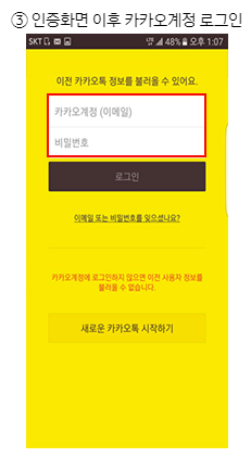 전화번호 인증이 끝나면 카카오 계정으로 로그인합니다. 계정에 로그인하지 않으면 복원 기능을 사용할 수 없으므로 반드시 로그인하세요.