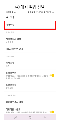 '채팅' 설정 메뉴에서 '대화 백업하기' 옵션을 선택하여 백업을 시작합니다.