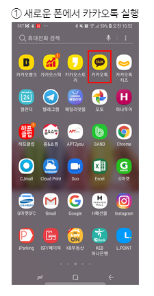 새로운 기기에서 카카오톡을 설치한 후 앱을 실행하여 전화번호 인증을 완료합니다. 전화번호 인증 후에는 카카오 계정 로그인이 필요합니다.