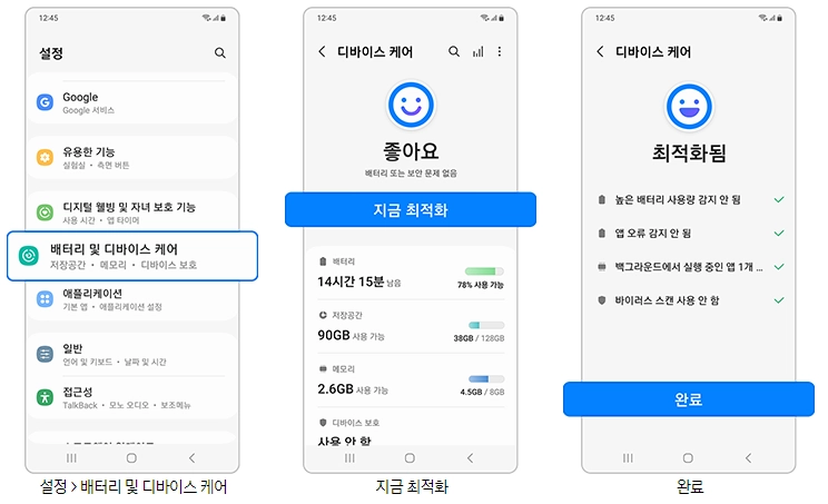방법1. 갤럭시 기기 최적화를 통해 높은 프로세서 사용량으로 배터리를 과다하게 소모하는 앱으로 인한 열을 최소화하세요.