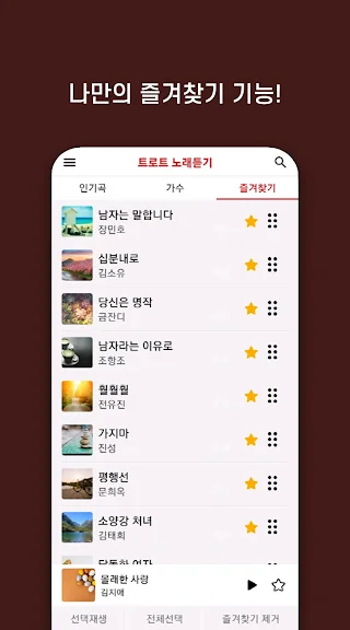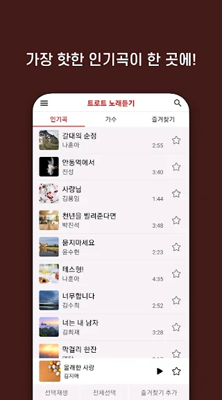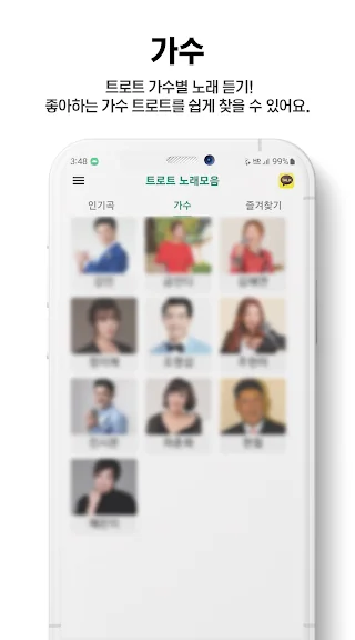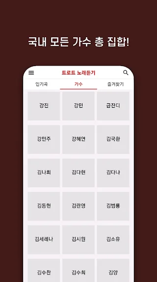 어플을 사용하려면, 원하는 트로트 곡을 제목이나 가수명으로 검색해 빠르게 찾을 수 있습니다. 또한, 좋아하는 가수를 선택하여 그들의 트로트 곡만 따로 감상할 수 있는 기능도 제공됩니다.