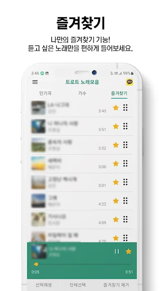 이 어플의 장점은 가수별 트로트 검색, 즐겨찾기 기능으로 나만의 트로트 목록을 만들 수 있다는 점입니다. 더불어 최신 곡들이 계속해서 업데이트 되어 항상 새로운 음악을 즐길 수 있습니다.