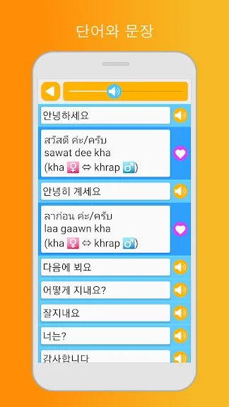 초보 태국어: 어휘와 문장 학습 어플에 대한 스크린샷 정보가 필요하시다면 아래 이미지를 참고하시기 바랍니다.