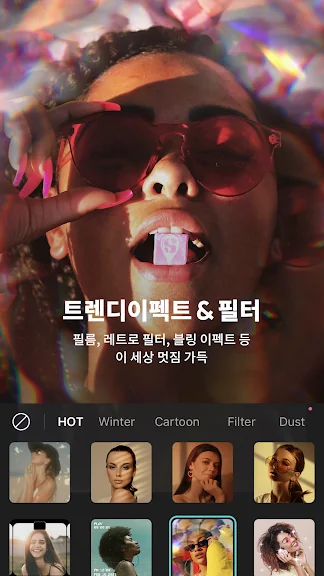 - 트렌디한 필터와 스티커, 텍스트 기능으로 사진을 개성 있게 꾸밀 수 있음