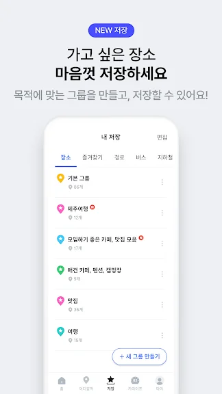- 맛집, 카페, 관광지 등 가고 싶은 장소를 나만의 그룹으로 저장하고 필요할 때 빠르게 찾아 이동할 수 있어요.
