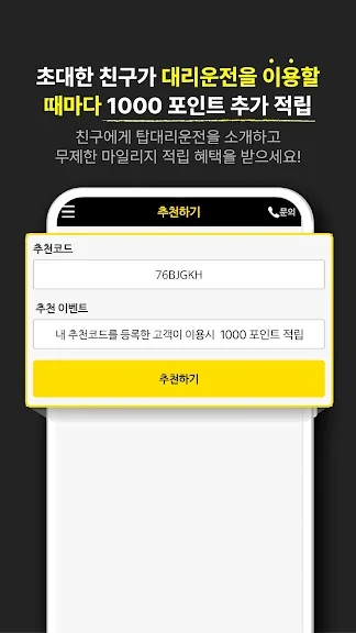 3. 추천받은 친구가 최초 대리운전 서비스 이용시, 추천한 친구에게 만원이 적립되며, 모아진 적립금은 현금이체 가능합니다.
