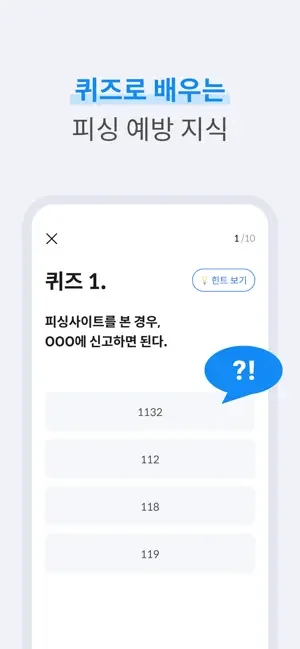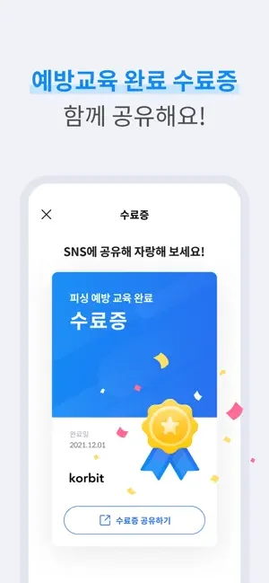 교육 콘텐츠와 웹툰에서 배운 내용을 토대로 피싱 예방 퀴즈를 풀고 수료증을 받으세요.