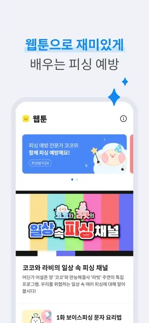 피싱 예방 전문가 코코와 라빗과 함께 웹툰으로 다양한 피싱 수법에 대해 배우고 함께 예방해요.