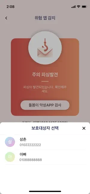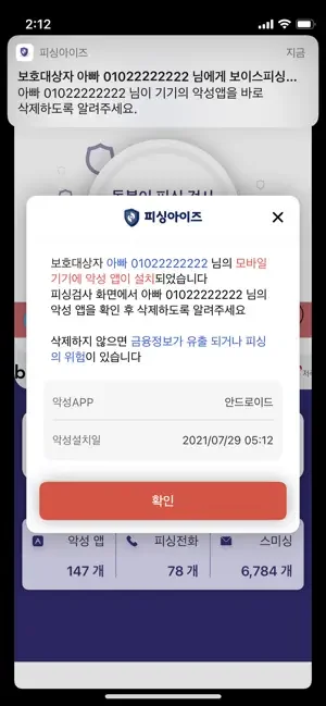 등록한 보호대상자의 핸드폰에 보이스피싱 및 해킹의 위험이 있는 악성 어플이 설치 및 탐지될 시 알림 제공