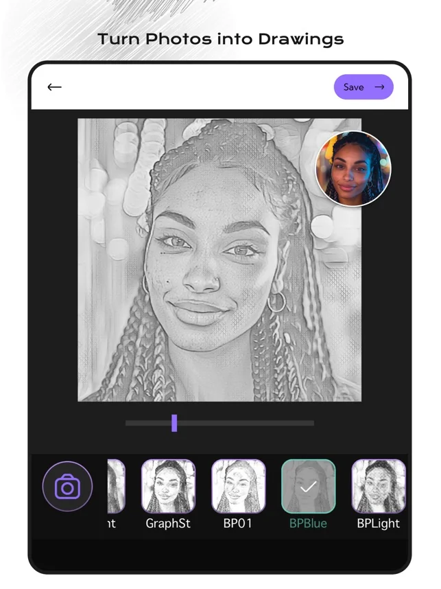 연필 스케치, 메모리 스타일 스케치, 블루 아트 스타일 스케치, 올드 무비 스타일, 스케이트 보드 스케치, 얼굴 프레임 스케치, 부드러운 스케치 : + 이제 50 개 이상의 서로 다른 스케치 효과를 특징으로