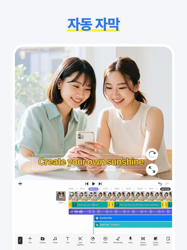 컷분할, 자막, 스티커, 배경음악, 효과음 및 트랜지션 등을 사용해 자유롭게 원하는 영상을 연출해보세요.