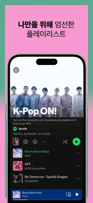 스포티파이는 전 세계 수많은 곡들을 언제든 손쉽게 즐길 수 있는 음악 앱이에요. 좋아하는 곡뿐만 아니라, 나만을 위한 추천 플레이리스트도 쉽게 찾아볼 수 있죠.