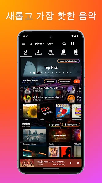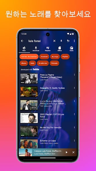 여러분이 좋아하는 유튜브 음악도 쉽게 찾아서 재생할 수 있는데요. 단, 다운로드는 아니고 스트리밍으로 감상하는 방식이에요. 멀티태스킹이 가능해서, 다른 앱을 사용하는 동안에도 플로팅 플레이어로 음악을 계속 들을 수 있어 편리하답니다.